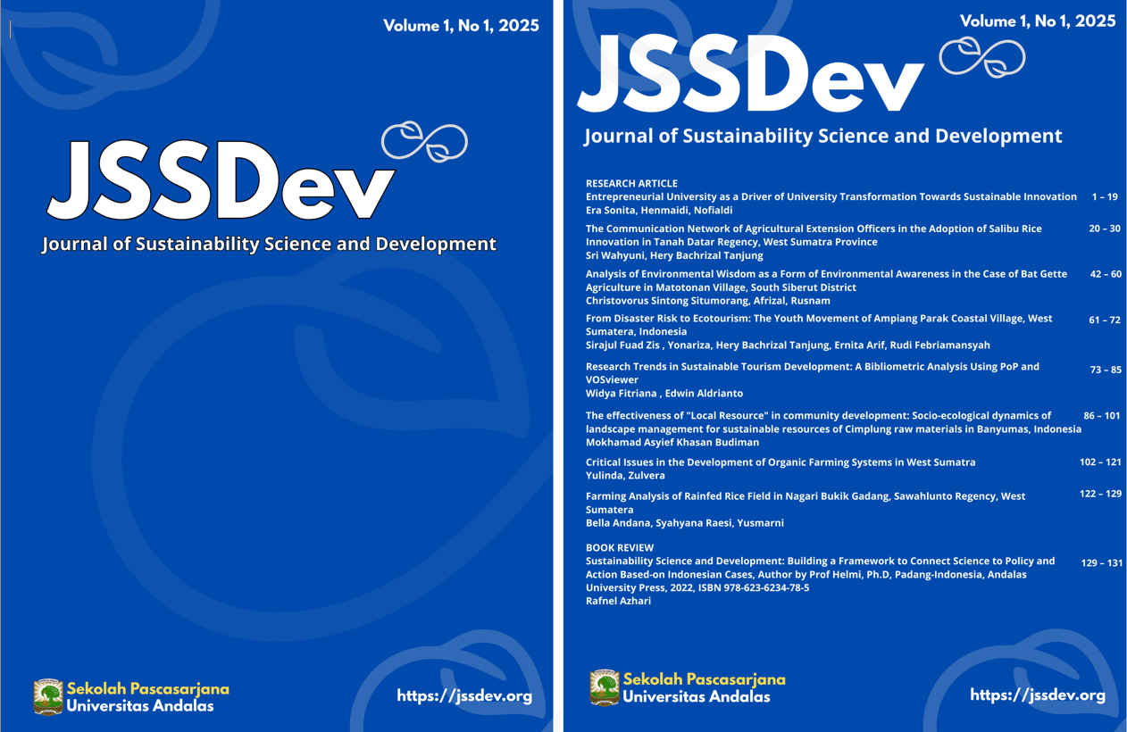 The Journal of Sustainability Science and Development (JSSDev) is an open-access and peer-reviewed journal that aims to publish scientific articles in the field of sustainability science and development. Sustainability science investigates interactions between global, social, and human systems, multifaceted processes leading to the degradation of these systems, and how they have affected human life. The key challenge of sustainability science is to assess the range of possible future directions under conditions of uncertainty and complexity and offer science-based innovative solutions. This journal is a platform for developing sustainability science as a crucial field of study in the 21st century within an interdisciplinary character of society, nature, science, technology, and policy and how it has been implemented in various development fields. JSSDev fosters knowledge exchange among researchers, practitioners, and policymakers worldwide.